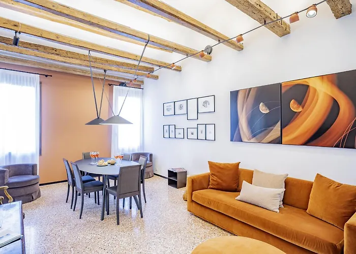 Este apartamento está situado en el distrito San Polo, a unos cuantos pasos del Gran Canal. A 900 metros se encuentra la parada de autobús más cercana, Venezia Piazzale Roma, y el Puente de los Descalzos está a 850 metros. No tardarás mucho en llegar al Arsenal de Venecia, situado a 2 km.